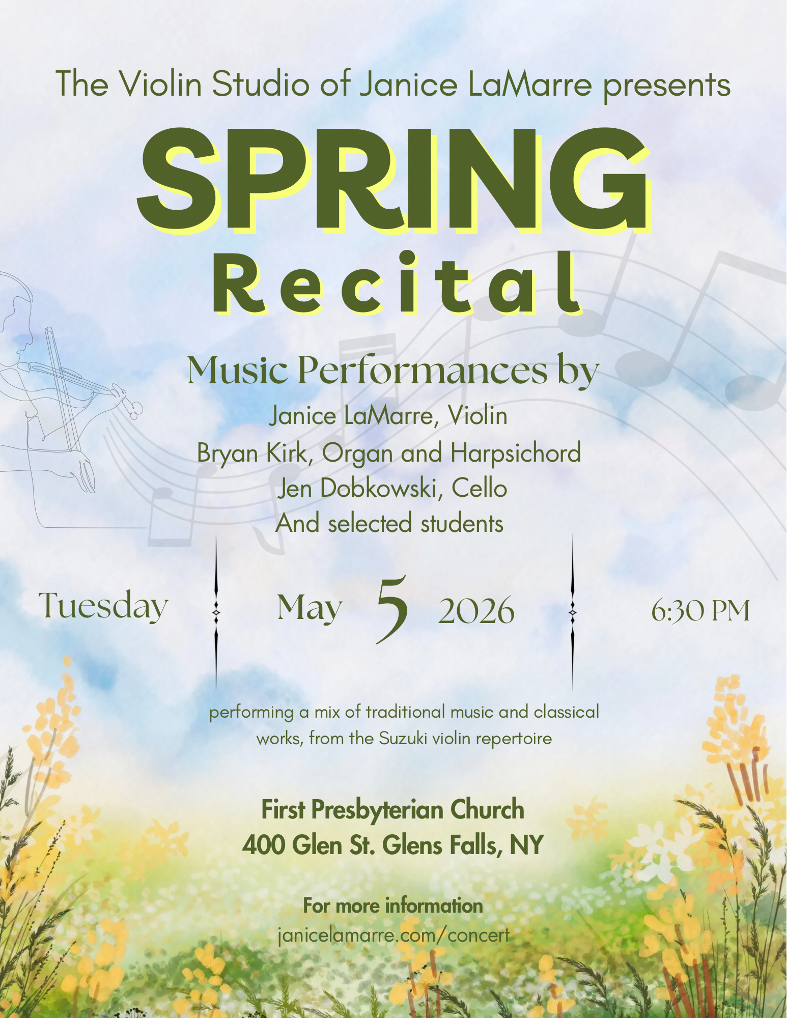 Students learn Suzuki-method violin or piano with their parent(s)’ help in a fun, group setting. A unique class website contains all class materials.